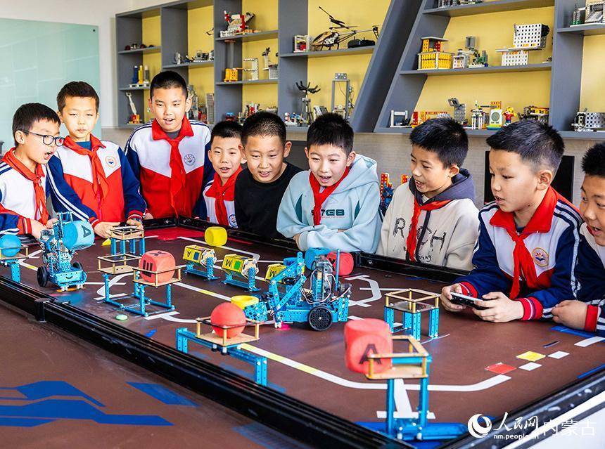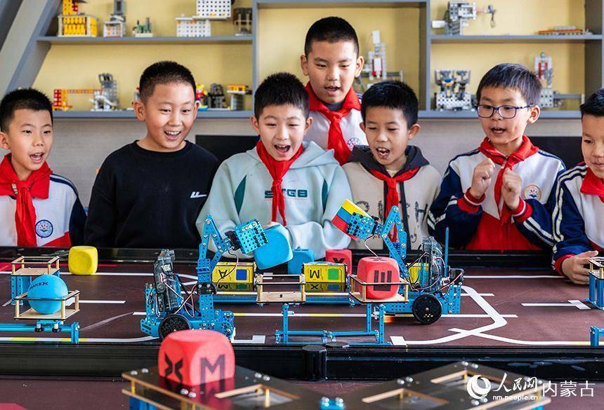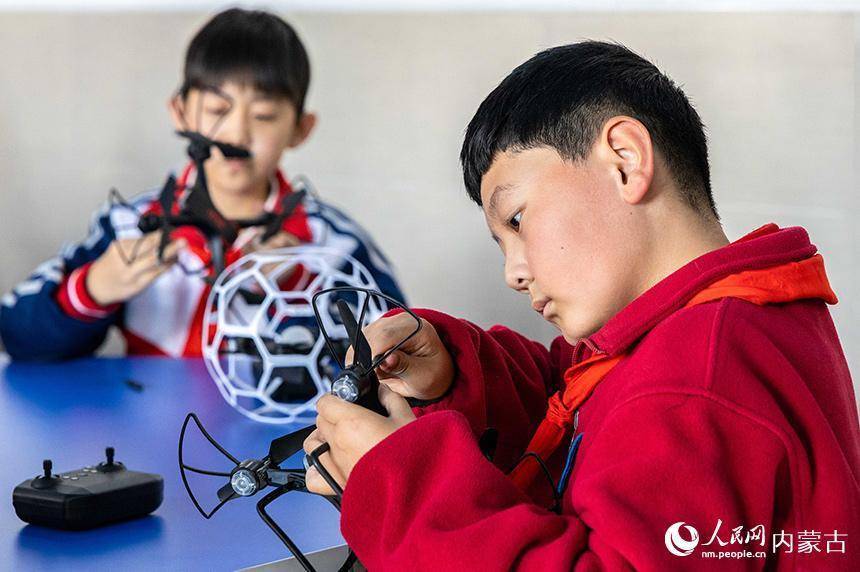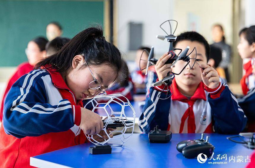 呼和浩特市玉泉区石东路小学无人机社团的学生在进行无人机障碍穿越科目训练。丁根厚摄近年来,内蒙古呼和浩特市玉泉区石东路小学通过开设无人机、编程机器人等科技类社团,并配套设计“基础操控—创意任务—竞赛挑战”的阶梯式课程,让孩子们在沉浸式探索中领悟科技奥秘,提升创新思维与实践能力。(丁根厚)
