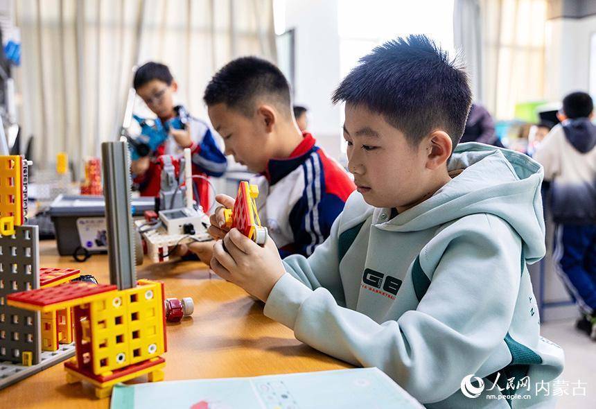 呼和浩特市玉泉区石东路小学机器人社团的学生在学习组装机器人。丁根厚摄